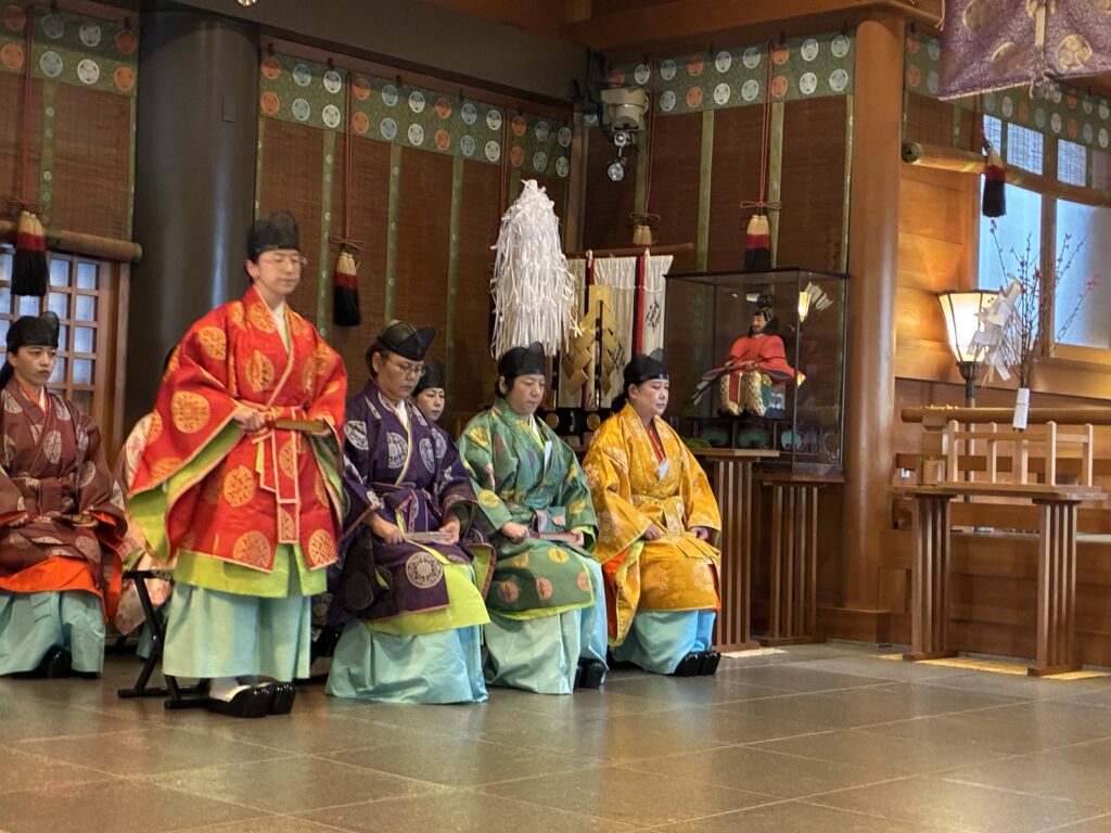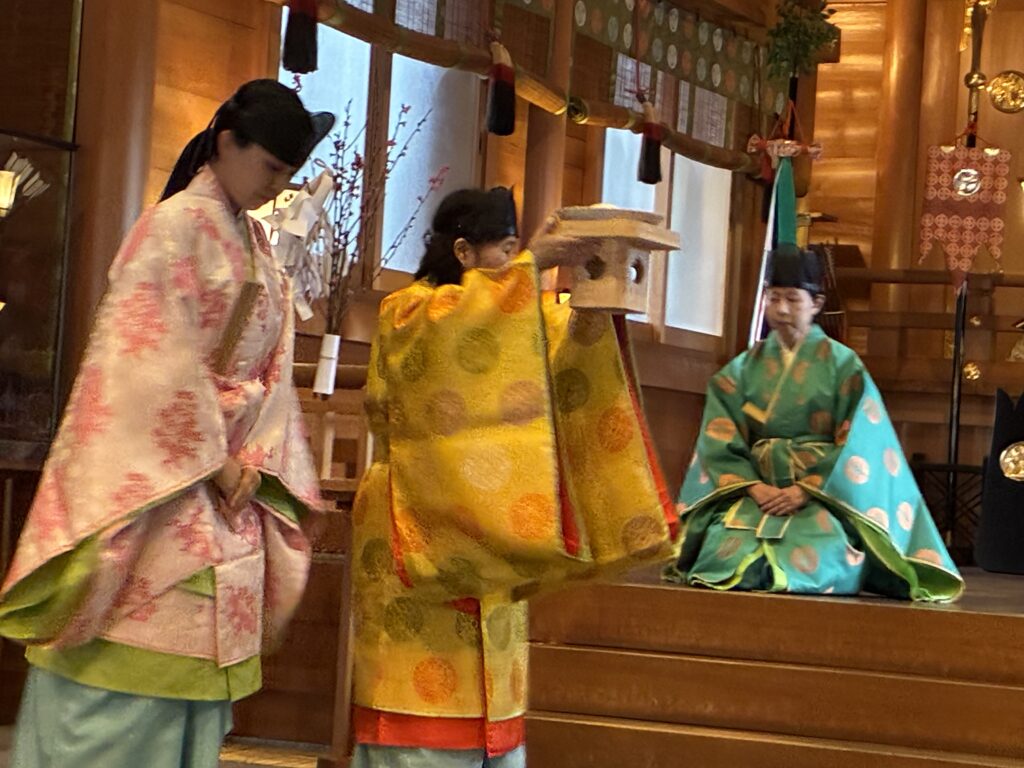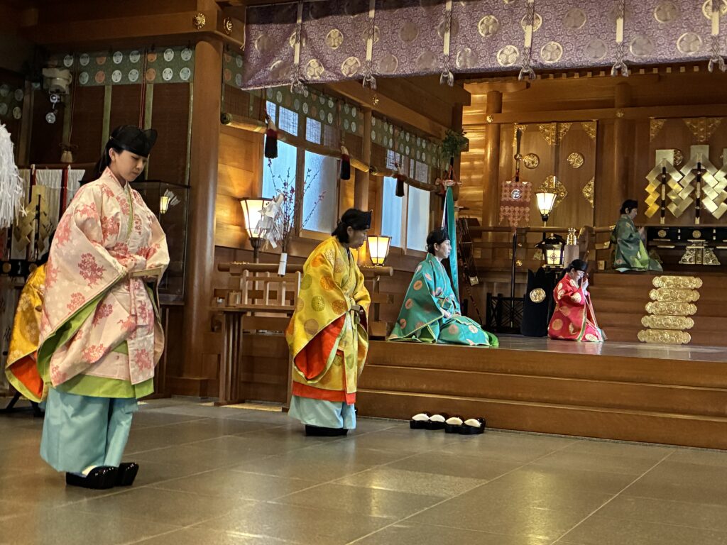 女性の神職の装束は煌びやかで、好きな色を選んで着用できるそうです。位と関係なく、気に入った色でいいですね〜。