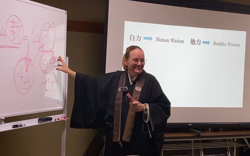 2025年度土佐組門徒会研修、今年度は京都教区敦賀組・高雲寺住職のジェシー釋萌海師にお越しいただき、「悲しみをご縁として出遇う世界〜to Meet with Living Nembutsu」と題して、スライドを使ってお話いただきました。